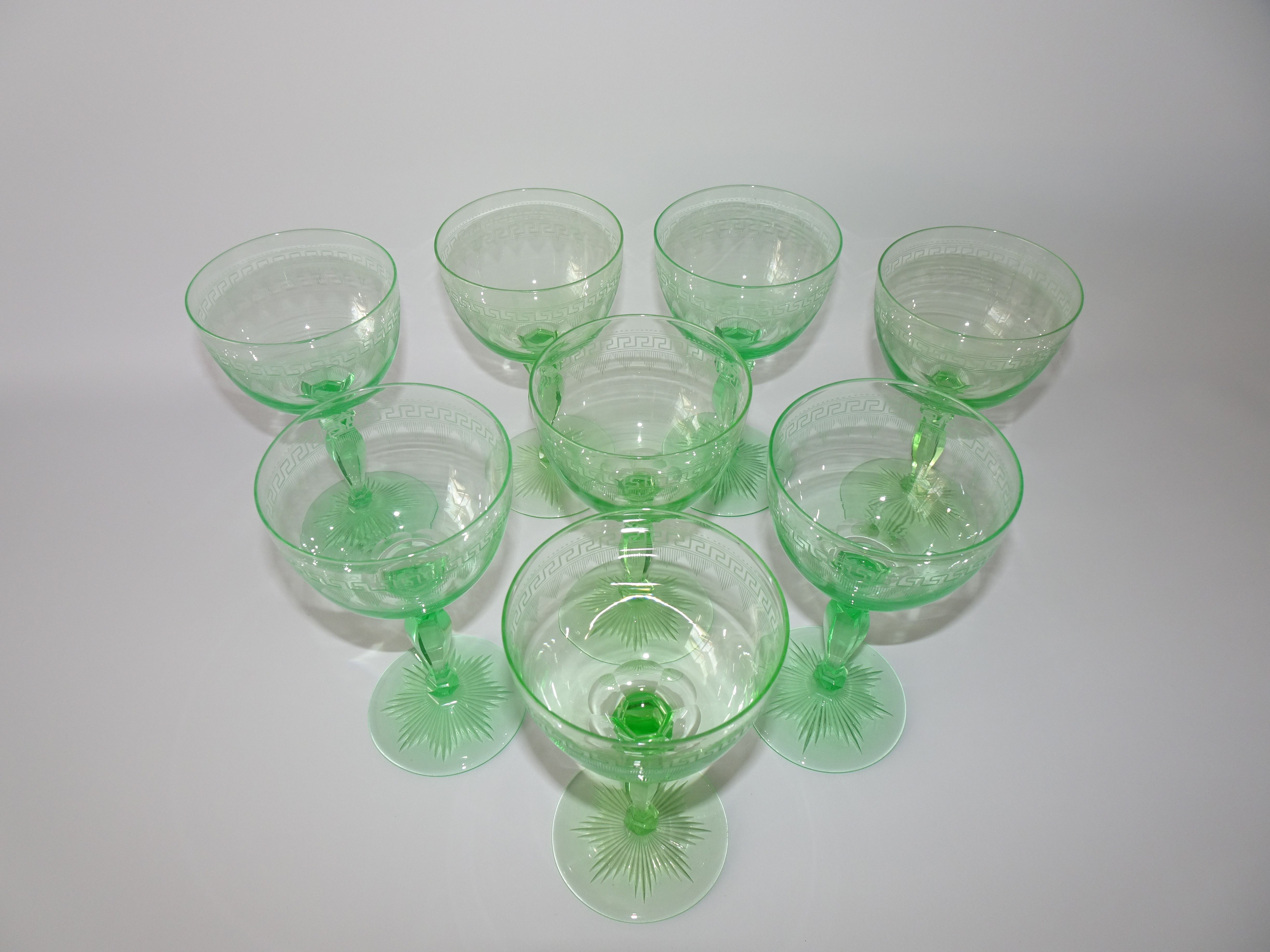 A beautiful antique set of 8 uranium cocktail glasses, each elegantly etched with a Greek key motif complemented by fine dot-and-line detailing. These striking glasses feature a facetted gourd-shaped stem and a star-cut base, showcasing the refined craftsmanship of early 20th-century glassmakers.